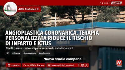 Flash News Aou Federico II - Angioplastica Coronarica, terapia personalizzata riduce il rischio di infarto e ictus.Novità da uno studio campano, coordinato dalla Federico II.Visita...